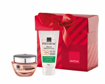 Presente Avon Renew Power – R$149,90 – O presente com a linha Renew vem com duas opções de cuidados coma pele: o Renew Power Creme Facial vem no formato mais queridinho das brasileiras/brasileiros: o creme. Ele deixa a pele hidratada instantaneamente, além de reverter anos de perda de colágeno e deixar a pele mais firme e preenchida e o Renew Solar Facial FPS30, formulado com Niacinamida e partículas matificantes que reduzem o excesso de oleosidade da pele. Oferece alta proteção dos raios UVA/UVB. Minimiza os efeitos causados pela luz visível e pelos raios infravermelhos. Indicado para pele muito sensível a queimadura solar. Não deixa a pele esbranquiçada.