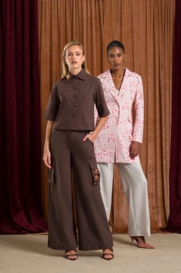 Nas versões em alfaiataria colorida, o Scrub Caterine é apresentado nas cores rosa e marrom, com blusa estilo camisa e bordado na gola, além de calça cargo com cós liso, fechamento em zíper e bordado sobre o bolso esquerdo. Já o Macacão Stella, também nas mesmas tonalidades, é sem mangas e conta com gola esporte, zíper na calça e faixa na cintura para ajuste. A coleção se completa com o Broche Flower feito à mão, que simboliza o toque final de brilho e delicadeza.
