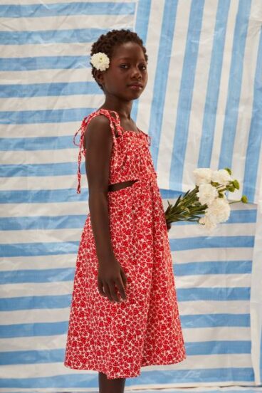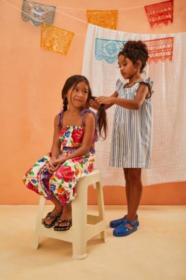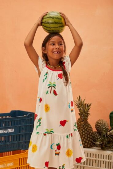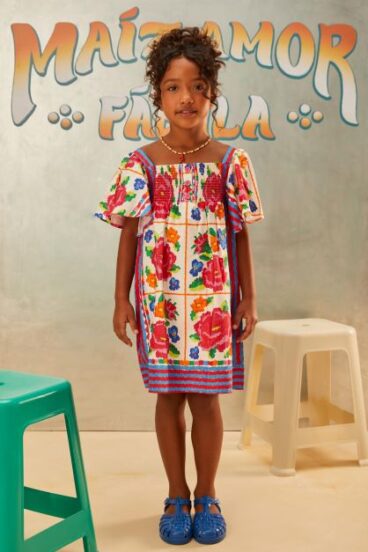 O milho, símbolo ancestral da generosidade da terra, dá nome à coleção: Maíz em sua multiplicidade de formas e cores, que vira pipoca, vira festa, vira fantasia. A partir dele, a Fábula trouxe estampas que percorrem mercados de rua, jardins encantados, florerias e pajaritos livres. São peças bordadas de histórias, recheadas de cataventos, chitas, fitas e cores que acolhem todas as infâncias.