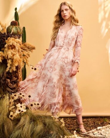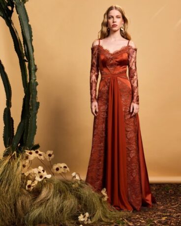 Ela aparece em duas versões de tecido: no chiffon de seda, para modelos esvoaçantes e sofisticados; e no linho natural, que traz toque rústico e elegância em peças que respiram o trabalho manual. Ao vestir essa estampa, a marca representa não só a beleza dos desenhos, mas também a força, a delicadeza e a história de um ofício que atravessa o tempo — eternizado em tecido, cor e forma.